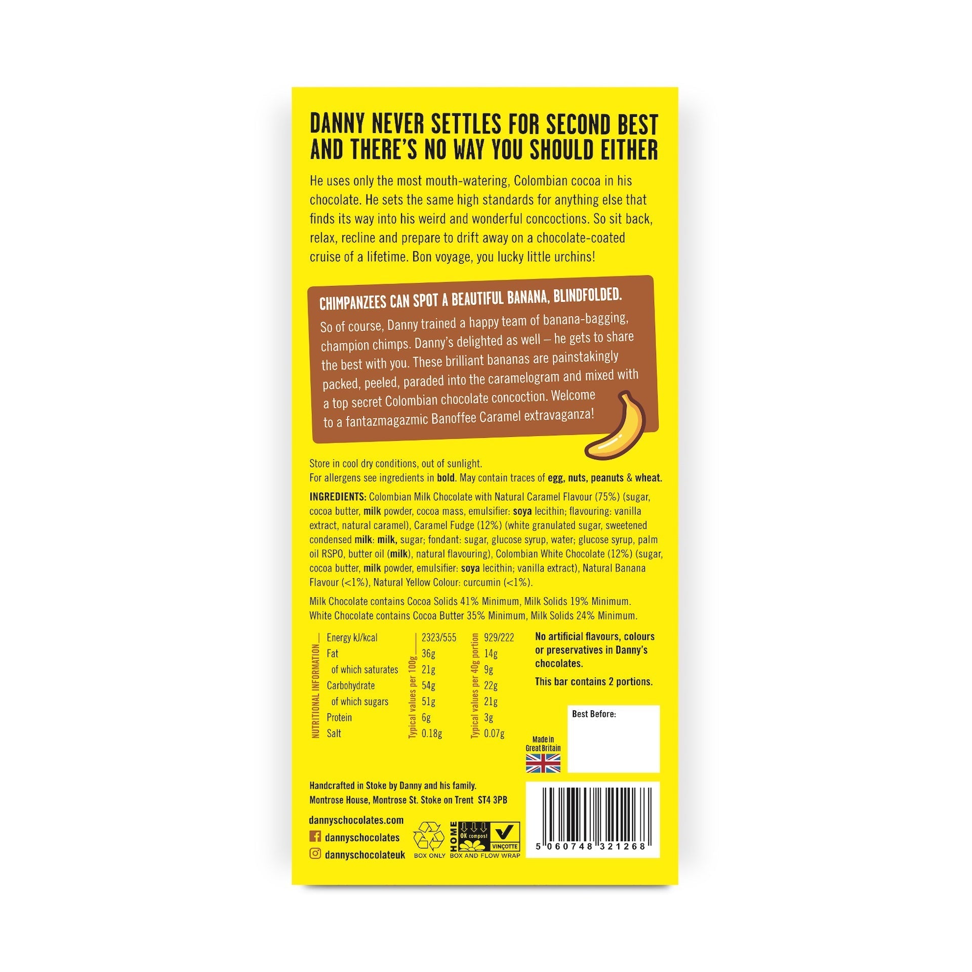 Colombian Milk Chocolate with Natural Caramel Flavour (75%) (sugar, cocoa butter, milk powder, cocoa mass, emulsifier: soya lecithin; flavouring: vanilla extract, natural caramel), Caramel Fudge (12%) (white granulated sugar, sweetened condensed milk: milk, sugar; fondant: sugar, glucose syrup, water; glucose syrup, palm oil RSPO, butter oil (milk), natural flavouring), Colombian White Chocolate (12%) (sugar, cocoa butter, milk powder, emulsifier: soya lecithin; vanilla extract), Natural Banana Flavour (<1%), Natural Yellow Colour: curcumin (<1%). Milk Chocolate contains Cocoa Solids 41% Minimum, Milk Solids 19% Minimum.White Chocolate contains Cocoa Butter 35% Minimum, Milk Solids 24% Minimum.