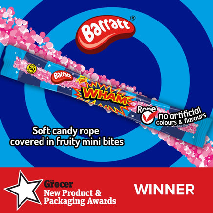Indulge in the irresistible tang of our Wham Rope—a vibrant sour raspberry candy rope coated with crunchy candy pieces for a textural sensation. Each rope delivers a burst of bold flavour that keeps you coming back for more, all while staying under 100 calories. Perfect for satisfying sweet cravings without the guilt, this delightful treat offers the ultimate taste experience in every bite.
