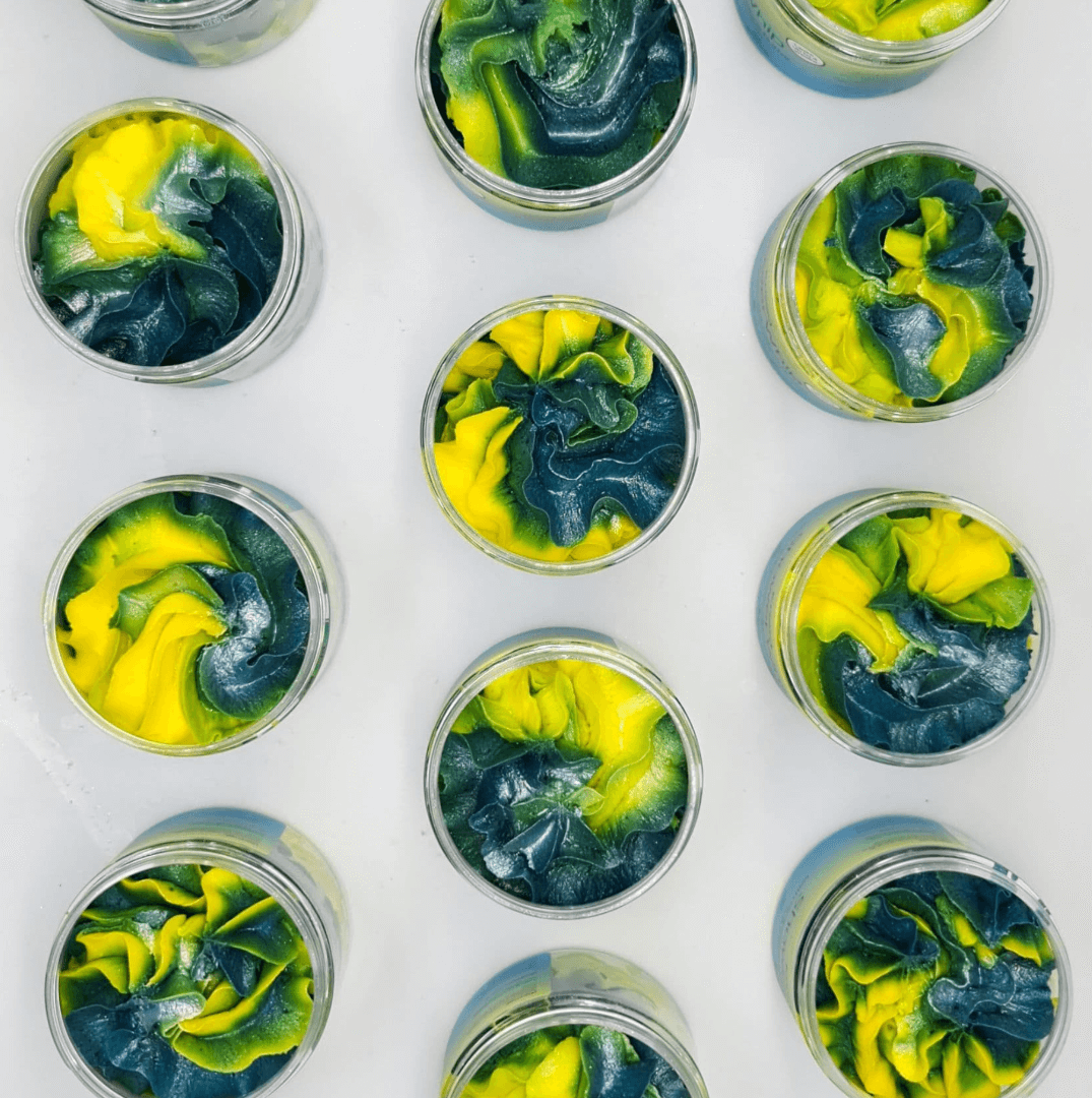 Glycerine, Aqua, Sorbitol, Sodium cocoyl isethionate, disodium lauryl sulfosuccinate, sodium chloride, phenoxyethanol, tetrasodium EDTA, Vitis Vinifera (grape) seed oil, Theobroma Cacao (Cocoa) seed butter, parfum, Potassium Aluminum Silicate E555, Titanium dioxide E 171, CI 16035, 19140, 42090, 77891. 3 CITRONELLOL, COUMARIN, GERANIOL, LIMONENE, LINALOOL.