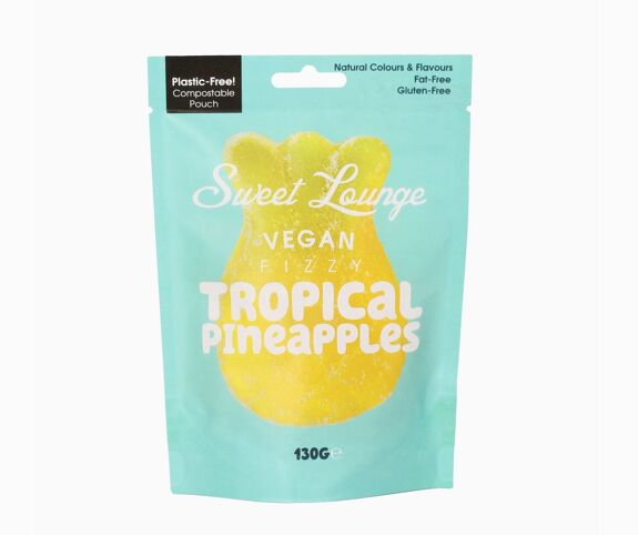 130g Expertly crafted plant-based Tropical Pineapple gummies with a tangy fizzy coating, presented in an eco-conscious plastic-free 130g share bag. These vegan-friendly treats deliver authentic tropical flavor in a sustainable format perfect for sharing.